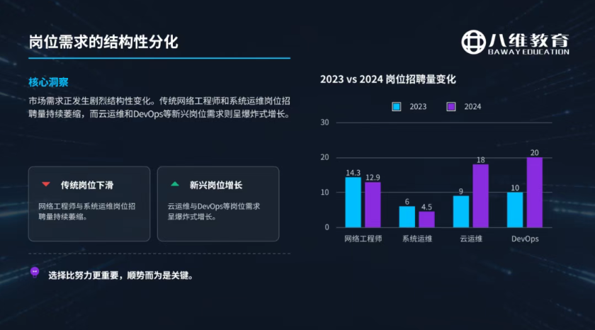 学生面临的挑战不在于能力不足,而在于学习方向需要调整。要改善就业状况,需要关注企业的实际需求,掌握当前所需的技术方向。DevOps工程师是连接这一差距的重要方向。
